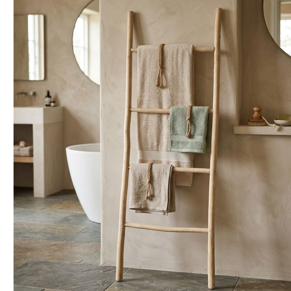 Cette échelle est connue sous le nom de The Tulum Ladder, un accessoire de décoration bohème fabriqué à partir de branches de bois naturel. Elle est principalement utilisée comme porte-serviettes dans une salle de bain ou comme support décoratif pour des plaids dans un salon.